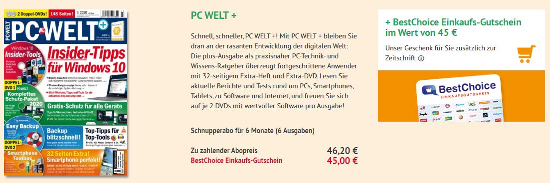Pc Welt Plus Halbjahresabo 6 Ausgaben Fur 46 Euro Mit 45 Euro Bestchoice Gutschein Als Pramie Snipz De
