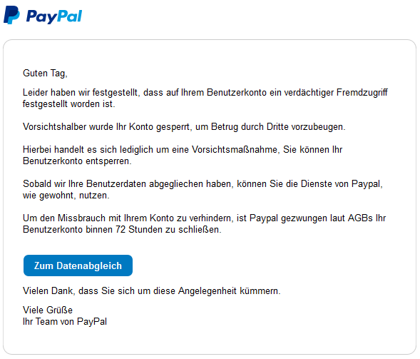 Sicherheit "Ihr PaypalKonto wurde gesperrt", so lautet mal wieder die Botschaft, um jemanden die persönlichen Daten abzujagen Gerade hat dieser PhishingVersuch mal wieder Hochkonjunktur Sofort auffällig ist, wie immer, das merkwürdige Deutsch Typisch ist auch, dass die persönliche Anrede fehlt und zum Teil die Interpunktion und die Rechtschreibung mangelhaft ist.