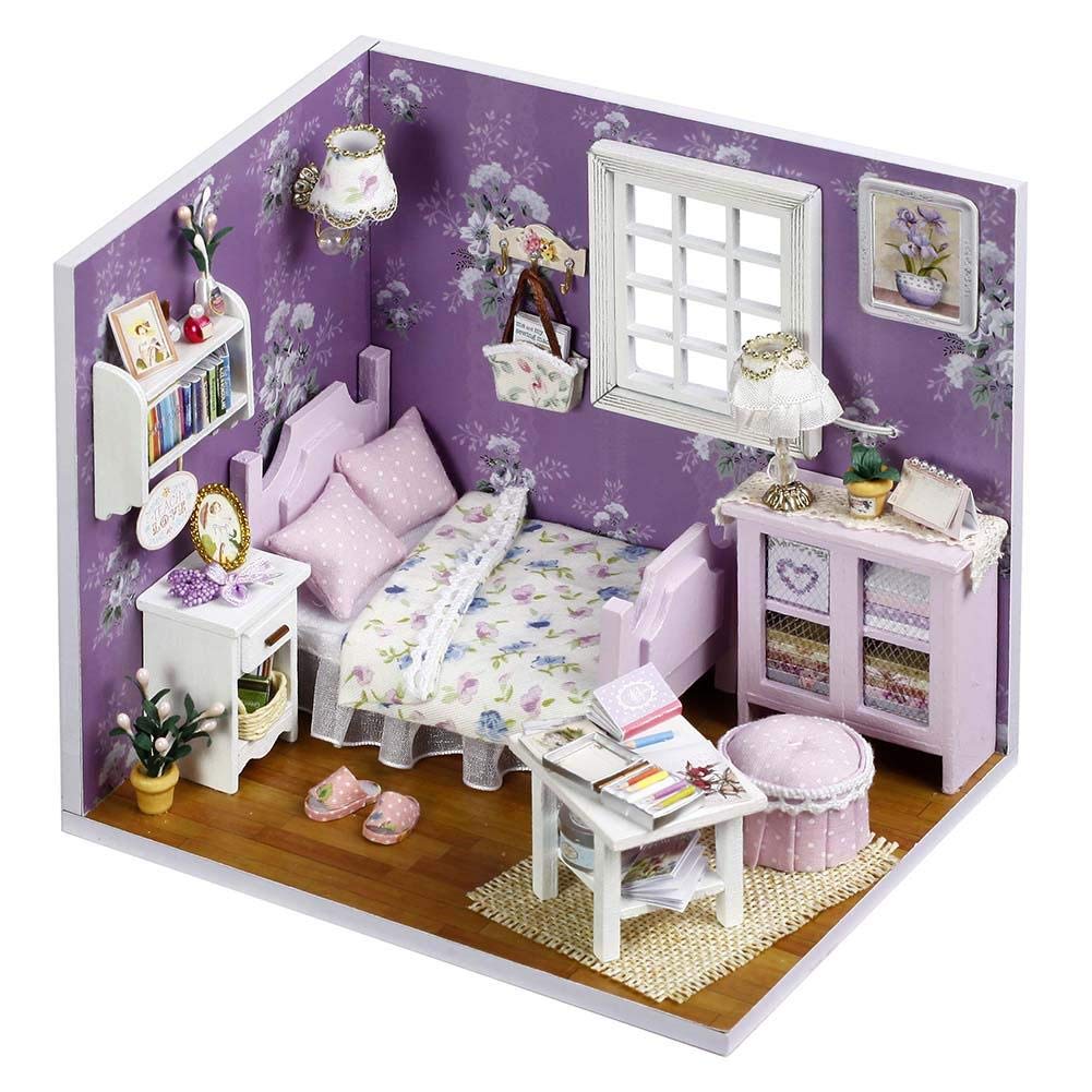 Hearthrousy Diy Puppenhaus Miniatur Haus Selber Bauen Zum Basteln Zubehor Holz Lernspielzeug Spielzeug Kinder 3d Susses Lila Traumhaus Mit Staubschutz Led Lichtern Hauser