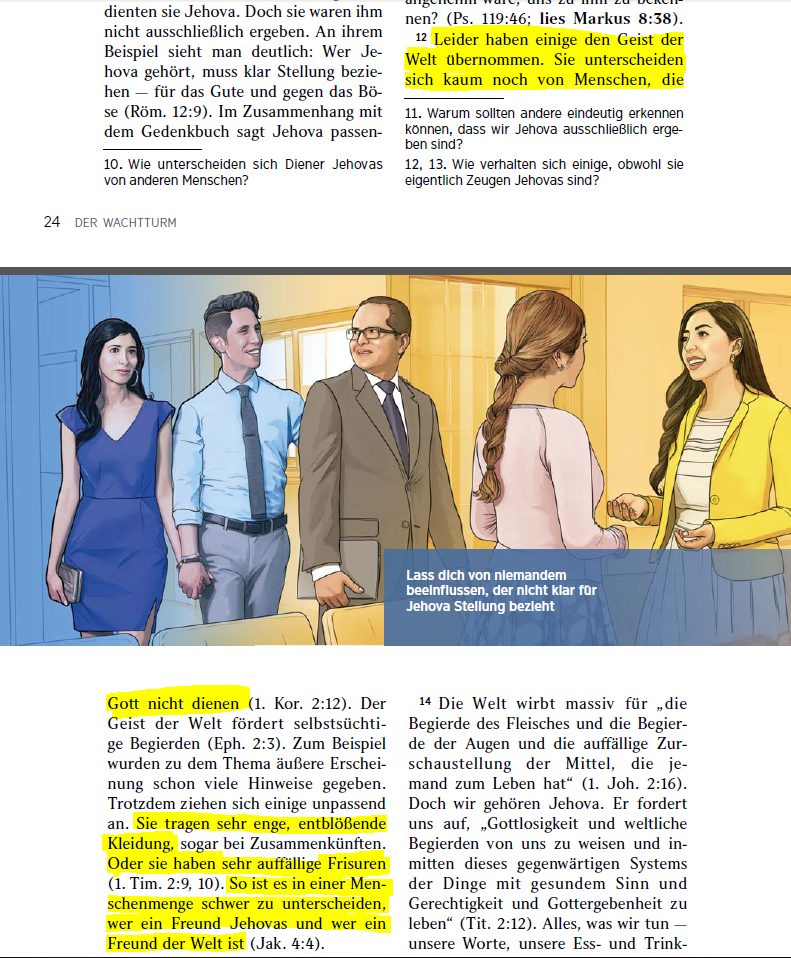 Die Kleidung, die bei einer solchen Gelegenheit getragen wird, sollte selbstverständlich ‘bescheiden und wohlgeordnet sein, wie es sich für eine Person ziemt, die Gott zu verehren bekennt’ (1 Timotheus 29, 10) Der Artikel „Christen sollten in vernünftigem Rahmen Hochzeit halten“ (Wachtturm vom 15 April 1969) enthielt folgende. Neue Kleiderordnung bei Jehovas Zeugen Eigentlich sind sie nicht wirklich neu, aber so plastisch wurden sie selten dargestellt Zwar gab es schonmal zwei Darstellungen von vermeintlich zu engen Hosen und einer hippen Frisur , die als völlig unpassend dargestellt wurden, aber nun scheint es in neue Extreme zu gehen, was die Kleidungsregeln. Eine Hochzeit in einer anderen Kirche ist praktisch undenkbar und kommt einem Selbstausschluss gleich Gerade jüngere Zeugen Jehovas sind hier natürlich unter Druck Die Sexualität erwacht, die Bekannten in der "Welt" dürfen scheinbar alles was sie nicht dürfen Das ist eine Phase, in der viele dann doch ein bisschen die obigen Regeln.