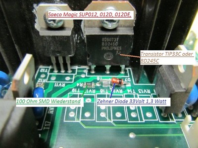 Liebe Schrauber, ich habe eine Saeco Cafe Nova, SUP018 CDR Diese hatte den Fehler "Brühgruppe blockiert" und bewegte sich nur noch ganz langsam Auf Grund von Infos habe ich den Transistor TIP 33C und die Zenerdiode ausgetauscht Das Getriebe wurde. Testmodus Vienna (Geräte ohne Display) Testmodus Nova (Geräte mit Display) Die Brühgruppe lässt sich mit der richtigen Anleitung aus dem SaecoSupport Forum problemlos zerlegen und reinigen Eine Anleitung für das Mahlwerk findet ihr hier Mahlwerk zerlegen Dampfrohr prüfen und umbauen Diese Werte gelten für die weiteren Widerstände 1. Blockierte Brühgruppe an der Saeco Vienna ausbauen Mit einem KreuzschlitzSchraubendreher die Schraube an der Brühgruppe heraus drehen Mit einem FlachschlitzSchraubendreher die Sicherung anheben (auf dem ersten ovalen Bild ist die Sicherung im eingebauten Zustand, auf dem zweiten im ausgebauten Zustand dargestellt).