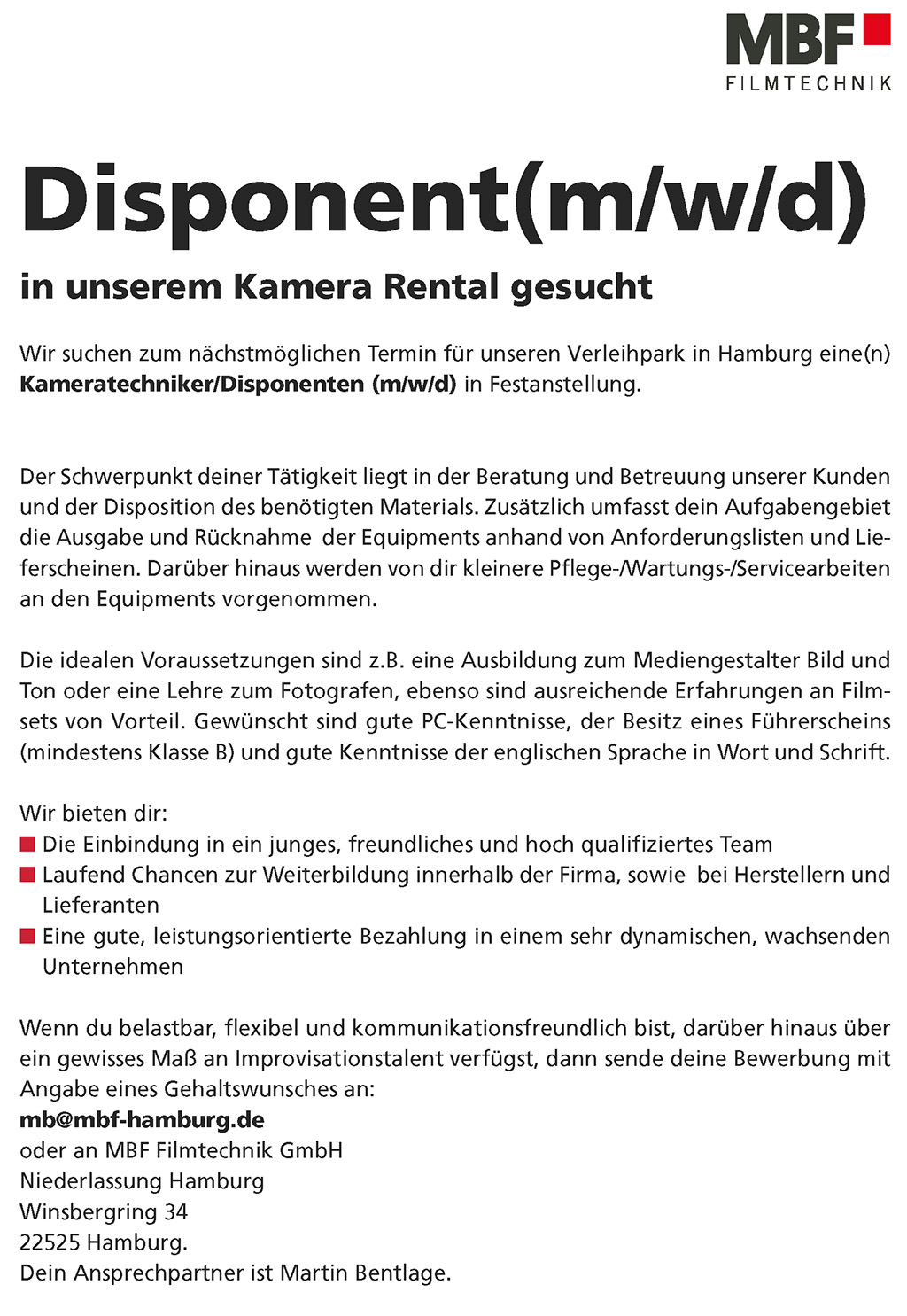 Mbf Filmtechnik Sucht Disponent M W D Kamera Rental Promedianews