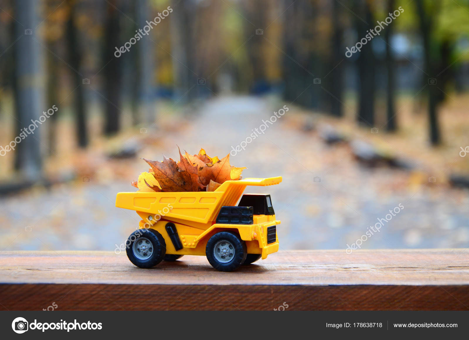 Ein Kleiner Gelber Spielzeug Lkw Ist Mit Gelbem Laub Beladen Stockfotografie Lizenzfreie Fotos C Mehaniq