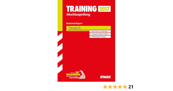 Das Kultusministerium stellt zur Abschlussprüfung einheitliche Aufgaben für die schriftliche Abschlussprüfung aller Realschüler in Bayern Im Fach Deutsch besteht die schriftliche Prüfung (240 Minuten) aus einem Aufsatz mit Gliederung Jeder Lehrer wählt für seine Klasse Themen aus, darunter mindestens eine Erörterung und mindestens. Die Staatlichen Schulämter nehmen Meldungen bis zum 1 März jeden Jahres entgegen und beauftragen eine oder bei Bedarf mehrere öffentliche Realschulen mit der Durchführung der Abschlussprüfung Informationen zur Abschlussprüfung Prüfungstermine, Informationen zum Rahmenthema Deutsch und Materialien mit Informationen zum Ablauf der Realschulabschlussprüfung für Schulfremde. 21 Training Abschlussprüfung Deutsch Realschule Bayern (NEU) Das Buch ist neu und hat ca 12€ gekostet Bei diesem Band ist kein OnlineTraining dabei.