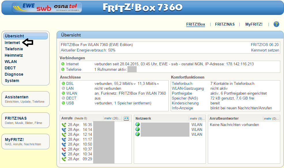 Fritz!Box 7360 EWE Edition Funktionen, Technische Details und Bilder 376 / 5 92 (92) Fritz!Box 7360 EWE Edition im Detail Die Fritz!Box 7360 EWE Edition vom renommierten Hersteller AVM bietet eine RundumSorglosAusstattung für Internet, Telefon und Heimnetzwerk, denn das Gerät vereint einen WLAN Router, eine Telefonanlage und einen Medienserver ;. No ads, no spyware, and no newsfeed manipulation You are our customer, your. Ihr bekommt einen neuen EWE Anschluss und habt die FRITZ!Box 7490 oder eine FRITZ!Box 7360 erhalten und wisst jetzt nicht so richtig, wie ihr sie installiert Beispielfoto einer AVM FRITZ!Box 7490 DSL/Tel FON 1 FON 2 FON s0 USB LAN 2 LAN 3 LAN 4 NetzanLAN 1 schluss 1.