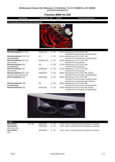 Preisliste Bmw 3er E46 Ulrich Motorsport