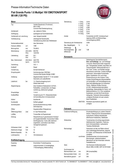 Presse Information Technische Daten Fiat Grande Punto 1 6 Multijet