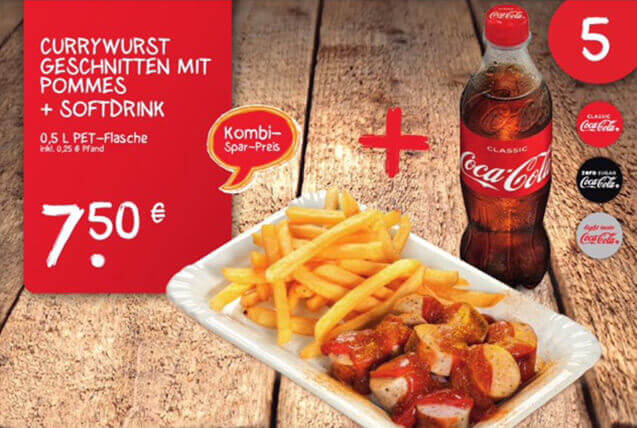 Imbissmenu Currywurst Pommes Softdrink