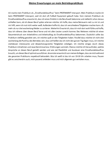 An sich ein richtiger Schritt Die Schüler werden in die Entscheidungsfindung mit einbezogen, formulieren die Regeln im Idealfall selbst und bringen so ihre eigenen Wünsche mit ein Dennoch spricht man in der Schule häufig nicht von Erwartungen, sondern von aufzustellenden Regeln In den Sommerferien habe ich mich fortgebildet und bin in. Beispiele Erwartungen an das Berufsfeld Schülerpraktikum Ich habe ein Praktikum im Bereich KFZMechatronik gewählt, da ich gerne handwerklich und praktisch arbeite Ich verspreche mir von meinem Praktikum einen intensiven Einblick in das genannte Berufsfeld zu bekommen. Ein Erwartungsbericht soll in der Regel vor dem Beginn des Schulpraktikums verfasst werden Es geht dabei darum, sich über die eigenen Erwartungen klar zu werden und diese nach Beendigung des Praktikums mit den tatsächlichen Erfahrungen vergleichen zu können.