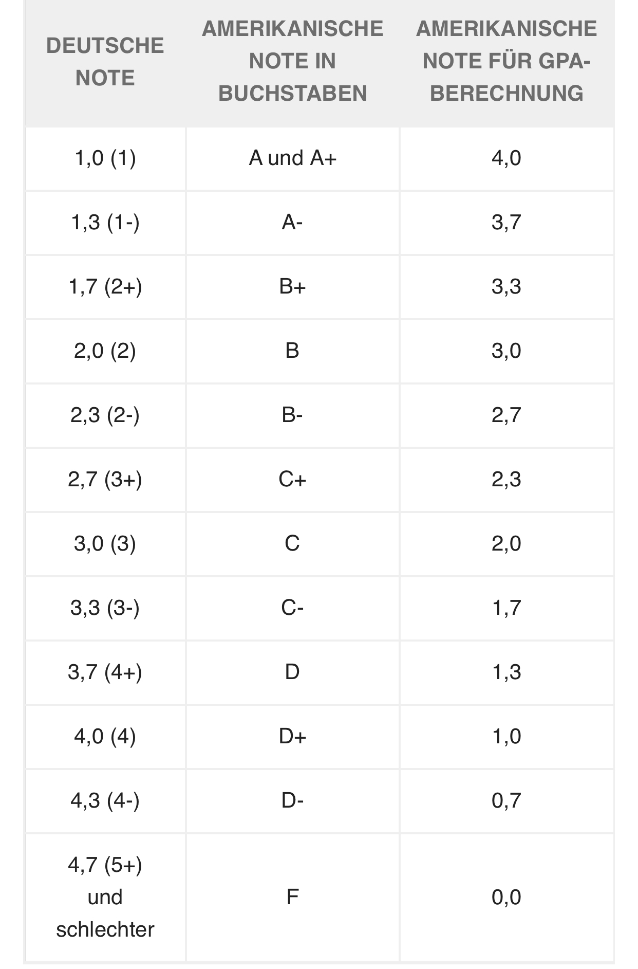 Die Umrechnung deines GPA kann für die Anerkennung von ausländischen Noten an deiner Schule notwendig sein Sowohl wenn du einen Schüleraustausch an einer amerikanischen Schule verbringen willst, als auch wenn du deine amerikanischen Noten nach dem Austausch an deiner Schule zuhause anerkennen lassen möchtest. Punkte in Noten umrechnen Tabelle In der folgenden Tabelle sind noch einmal alle Notenpunkte zur Übersicht aufgelistet, sowie die entsprechenden Schulnoten mit plus und minus Abstufungen Für die exakten Dezimalwerte muss man auf den Notenrechner bzw Noten Umrechner (oben) zurückgreifen. Je höher deine Punktzahl und deine Abiturnote desto besser sind deine Chancen auf einen Studienplatz Es sind maximal 900 Punkte erreichbar (1,0) und es müssen mindestens 300 Punkte erreicht werden (4,0) Beachte aber bitte, dass es auch bei einer Mindestpunktzahl möglich ist, nicht bestanden zu haben, wenn zB zu viele Unterkurse vorhanden sind.
