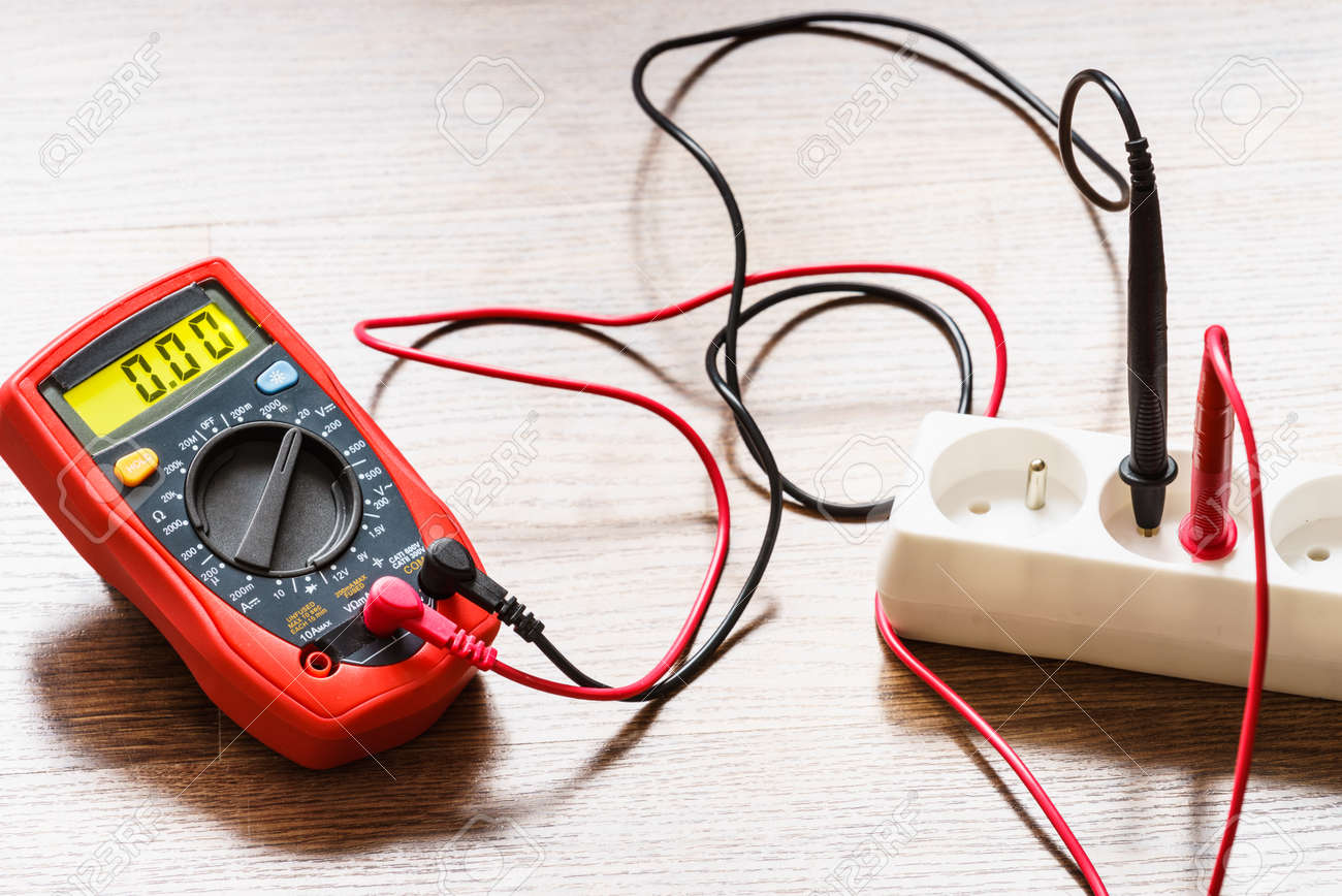 Messung Der Spannung In Steckdose Verlangerungskabel Mit Multimeter Auf Holzboden Hintergrund Lizenzfreie Fotos Bilder Und Stock Fotografie Image