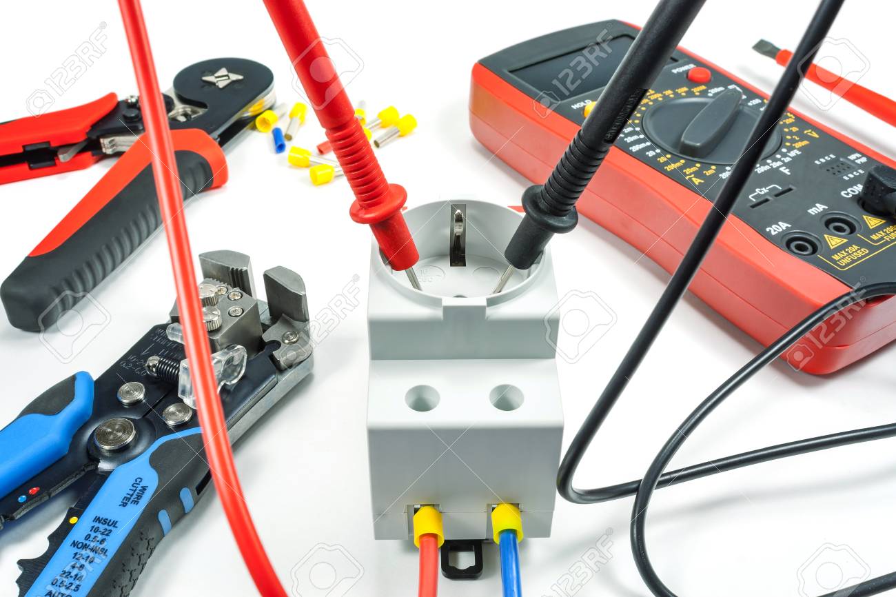 Messung Der Spannung In Der Steckdose Mit Einem Multimeter Auf Einem Weissen Hintergrund Lizenzfreie Fotos Bilder Und Stock Fotografie Image