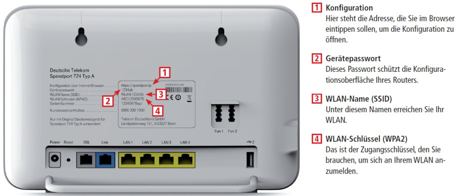 Den Speedport konfigurieren Sie brauchen ja eigentlich nur auf den Speedport zugreifen, wenn Sie ihn konfigurieren möchtenDazu benötigen Sie das Passwort, das sich auf der Rückseite des Routers befindet Wie bereits oben beschrieben, geben Sie die Adresse des Speedports in die Adresszeile des Browsers ein und gelangen damit in das. Re Routertausch von Speedport W724V auf FritzBox 7590 > an LAN Buchse keine Funktion des GS116, Hallo @Airman81 , also das es etwas mit der EnergyEfficientEthernet nach IEEE 8023az glaube ich definitiv nicht. Auf dem Typenschild und im Router‐Pass finden Sie die Werkseinstellungen für den WLAN‐Namen, den WLANSchlüssel und das Gerätepasswort Ihres Speedport Smart Wir empfehlen Ihnen, diese Daten umgehend zu ändern Notieren Sie die Daten bspw auf dem RouterPass und bewahren Sie diesen an einem sicheren Ort auf.