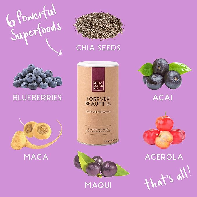 Amazon Com Your Super Forever Beautiful Superfood Mix Plant Based Powder Skin Hair Health Natural Collagen Acai Berry Chia Seeds Maqui Acerola Cherries Maca Blueberry 7 05 Ounces 40 Servings Health Personal Care