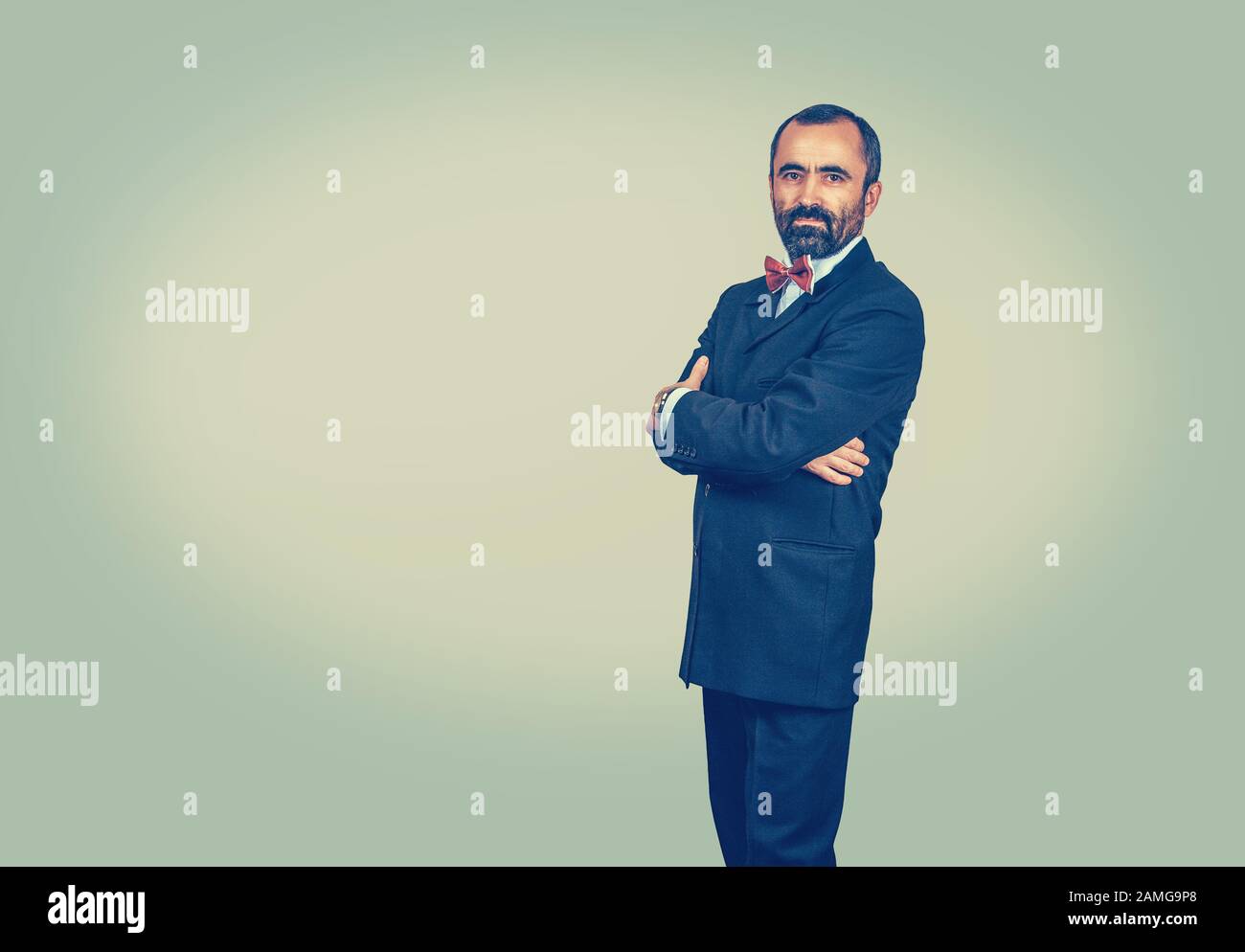 Hubscher Eleganter Mann Tragt Blauen Anzug Mit Fliege Stockfoto Bild Von Hubscher Anzug