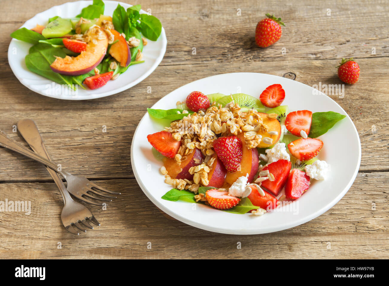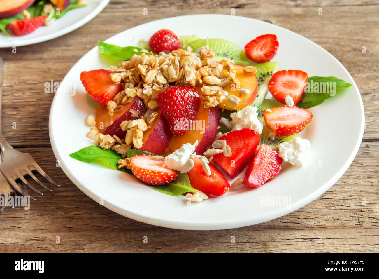 Frischer Fruchtsalat Mit Hausgemachtem Musli Feta Kase Und Honig Auf Weissen Teller Fur Gesunde Vegane Ernahrung Vegetarische Bio Fruhstuck Essen Essen Salat Stockfotografie Alamy