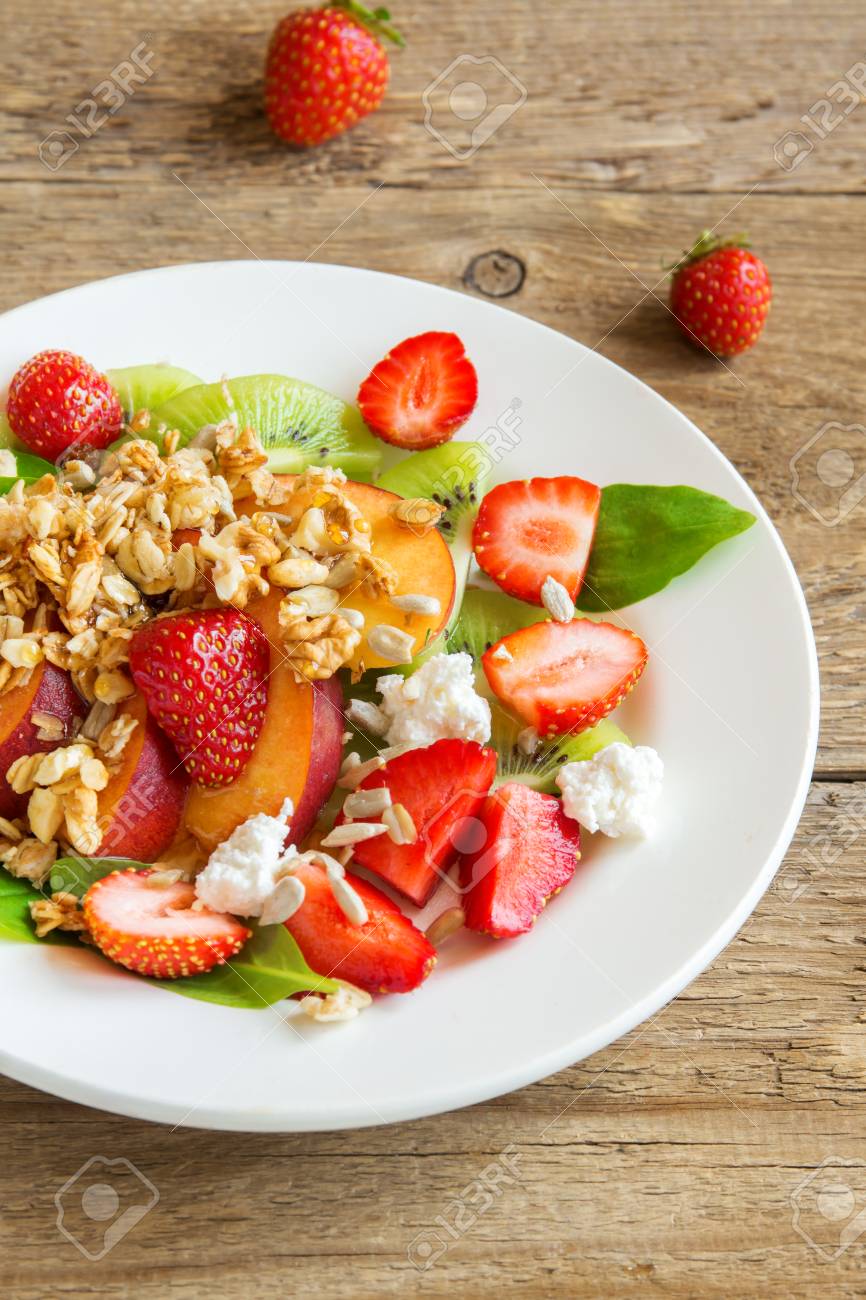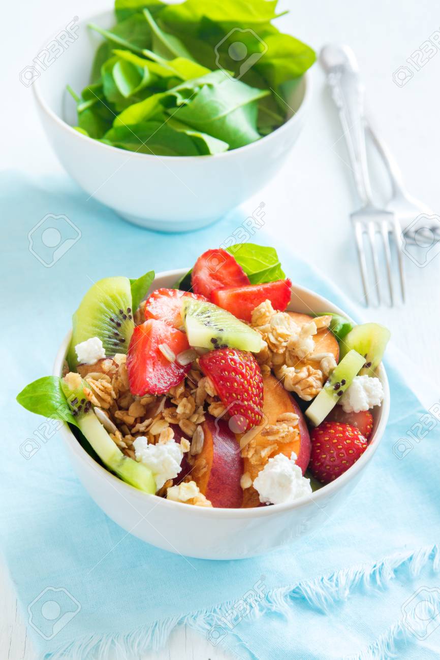 Frischer Obstsalat Mit Hausgemachtem Musli Feta Kase Und Honig Auf Weissem Teller Fur Gesunde Vegane Ernahrung Vegetarische Bio Fruhstuck Essen Essen Salat Lizenzfreie Fotos Bilder Und Stock Fotografie Image