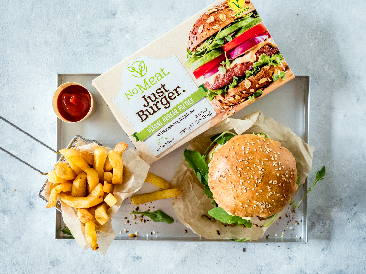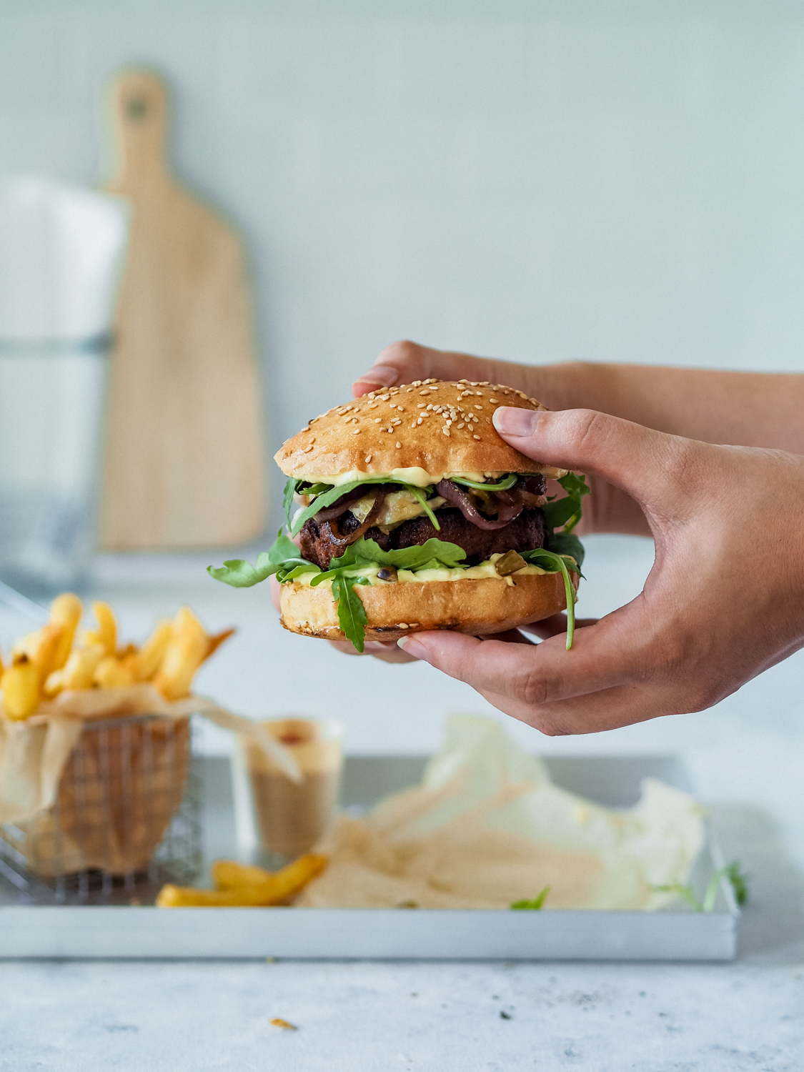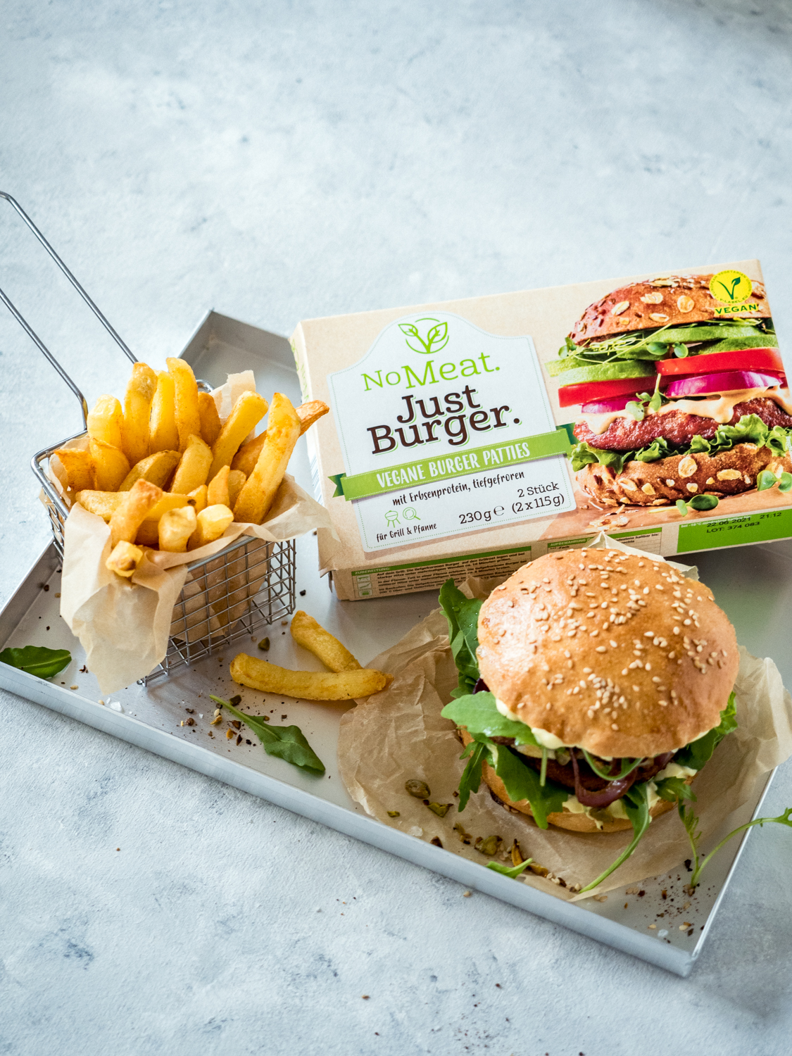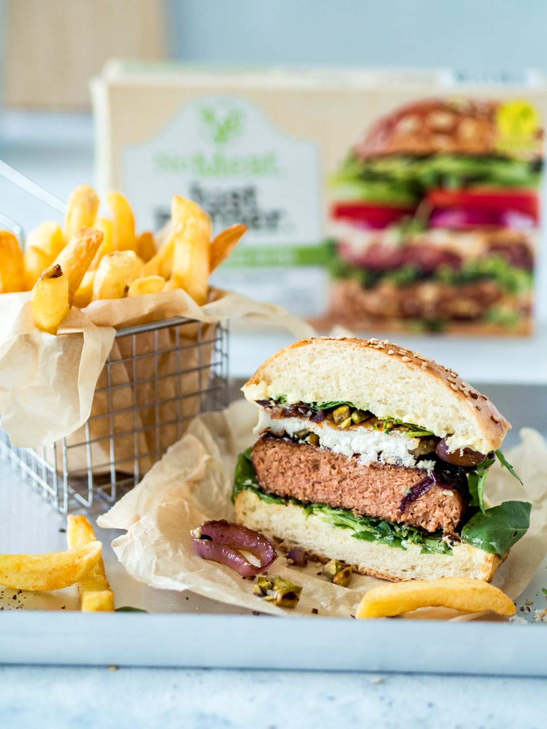 Veggie Burger Mit Pistazien Ziegenkase Rucola Roten Zwiebeln Und Veganer Honig Mayo
