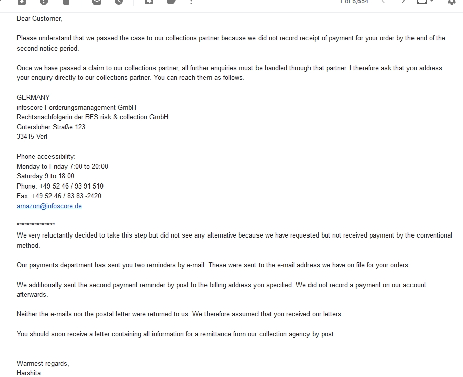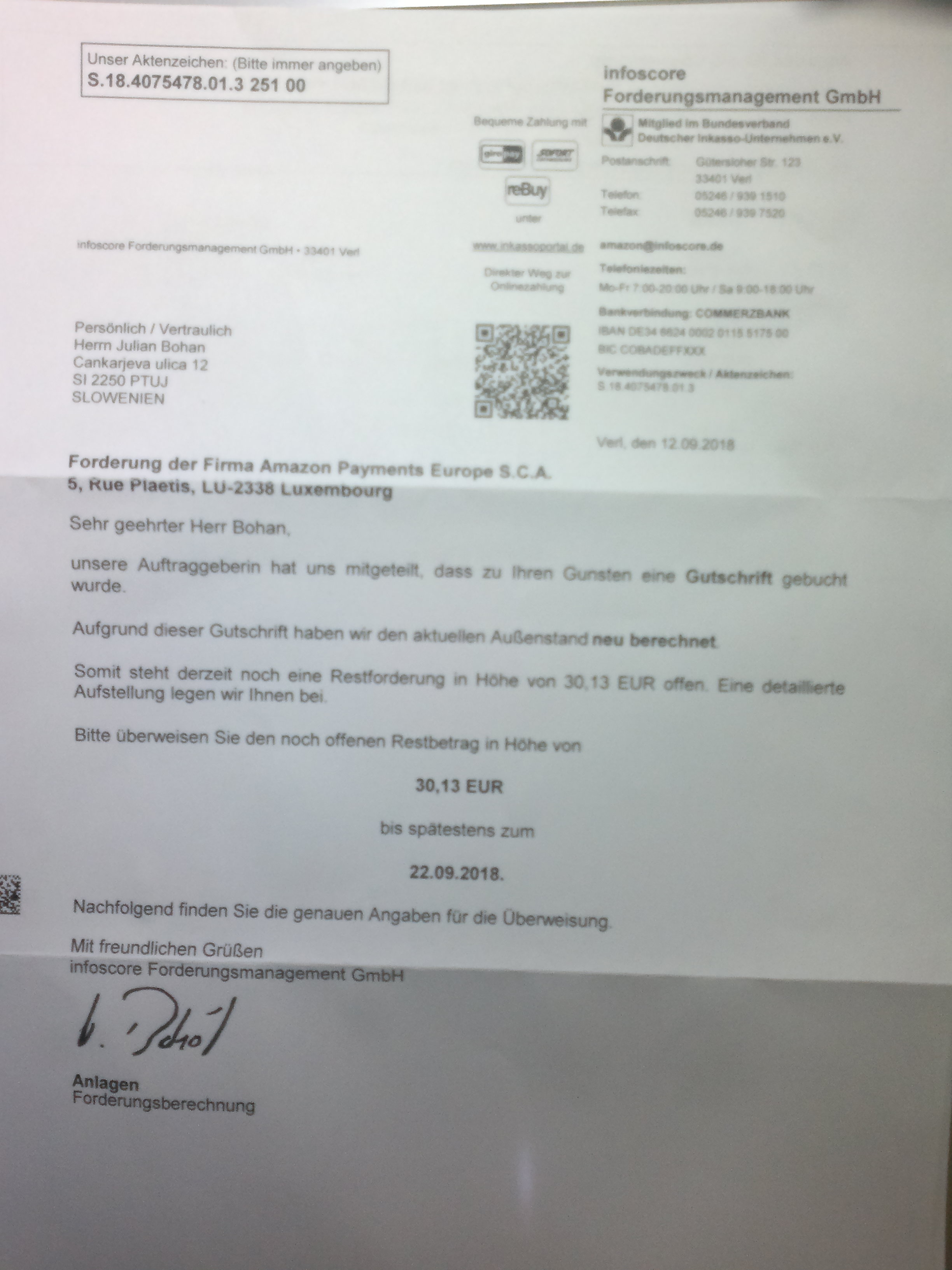 Infoscore forderungsmanagement gmbh amazon. Am erhielt ich eine Zahlungsaufforderung der infoscore Forderungsmanagement GmbH im Namen der Firma Amazon EU Sárl 38, avenue John F Kennedy, LU1855 Luxemburg über 81,40 Euro Angeblich soll ich über das Internet die „Ltd Fanbox XY AK“ bestellt haben, was aber nie der Fall war. Cancel Unsubscribe Working Subscribe Subscribed Unsubscribe 397K. Amazon /Arvato Payment / Infoscore stellt die Zahlungsaufforderung ein Frau Ramona S schrieb uns am 2402 Betreff Nicht bestellte und nicht gelieferte Artikel werden in Rechnung gestellt Kundenoder Vertragsnummer Bestell Nummern Es betrifft die Bestellungen mit der Nummer und Es betrifft die Bestellungen mit der Nummer.
