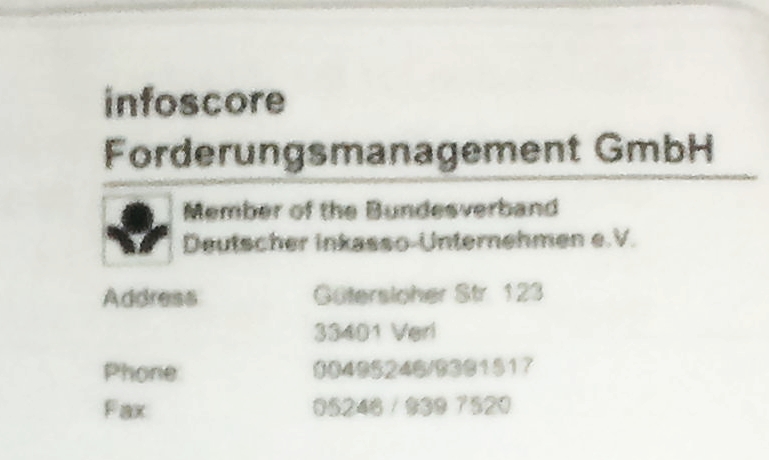 Inkassode verwendet Cookies, um Ihnen den bestmöglichen Service zu gewährleisten Wenn Sie auf der Seite weitersurfen, stimmen Sie der CookieNutzung zu. (derzeit die REAL Solution Inkasso GmbH & Co, KG, Normannenweg 32, 537 Hamburg und die infoscore Forderungsmanagement GmbH, Gütersloher Str 123, Verl) 75 Zur Qualitätssicherung der statistischen Ermittlung von Einschaltquoten bzw der Reichweite des. Unseriöse Inkassoforderung über InternetKauf oder Dienstleistung Neuerdings fordern einige Inkassofirmen (zB Infoscore Forderungsmanagement GmbH in Hier wurde bei einer Mandantin ein Kauf über PayPal (Europe) Sarl et Cie Paypal Inkasso Infoscore Arbeitszeiterfassung mit Excel Video Abzocke durch Inkasso Richtig reagieren.
