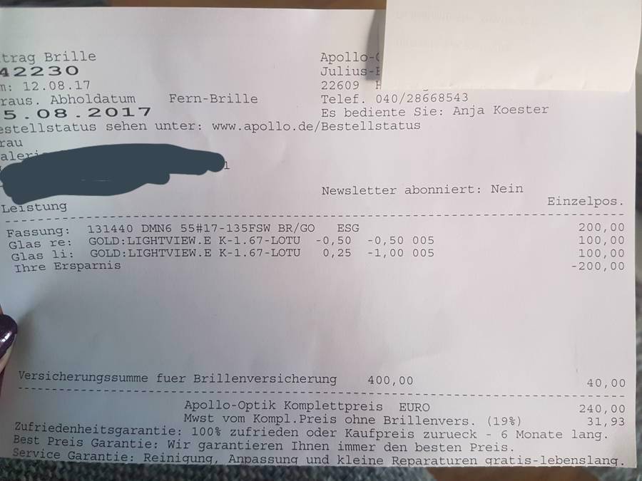Ich also zu Apollo, obwohl ich nichts bestellt habe Meine Beschwerde hat wohl bewirkt, daß von der Zentrale aus entschieden wurde die Sache doch auf Kulanz zu entscheiden Nun habe ich eine neue Brille erhalten Damit hatte ich nicht gerechnet Also vielen Dank an Apollo. Wollte fragen ob man diese zurückgeben kannEs wird ja mit der Zufriedenheits Garantie geworben Da ich diese Brille auf der online seite von apollo um die Hälfte reduziert sah von 140,€ auf 70,€ hat jemand Erfahrungen bei der Reklamation bei Apollo Optik. Anzeige Beschreibung der Reklamation Ich habe mir im September 17 bei ApolloOptik Hanau in eine vorhandene Titanfassung Gleitsichtgläser mit Entspiegelung und Tönung einbauen lassenGesamtpreis 315,00 € Neben dem Problem, dass sich die Gläser immer wieder lockerten (mittlerweile hat Fielmann das Problem dauerhaft gelöst), löste sich nach ca 2 Jahren die Entspiegelung/Tönung des.