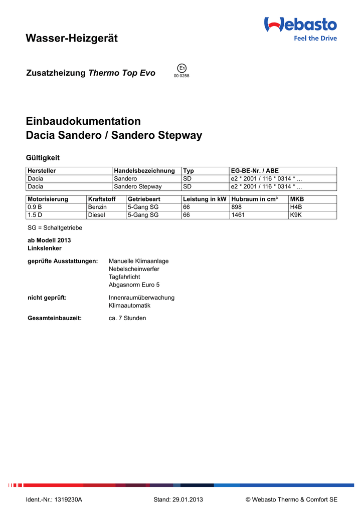 Wasser Heizgerat Einbaudokumentation Dacia Sandero Sandero Stepway Thermo Top Evo Manualzz