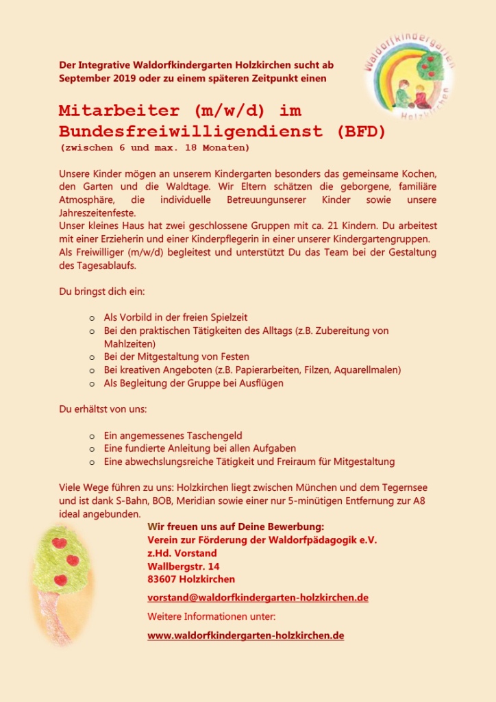 Bewerbung für FSJ und BFD Vorlesen Hier findest du Informationen, freie Stellen und Bewerbungsunterlagen für deinen Freiwilligendienst in diakonischen bzw evangelischen Einrichtungen – sortiert nach Bundesländern. Kindergarten und Kita Spielen, trösten, schlichten und organisieren sind nur einige der Aufgaben, bei einem BFD 27 in einer Kindereinrichtung Freiwillige gestalten das pädagogische Angebot mit, helfen in der Hauswirtschaft und bei Elternabenden oder Projekten. Schulkindergarten Buchen KarlTschamberStr 6 Buchen Tel / Fax / EMail leitung@schulkindergartenbuchende.