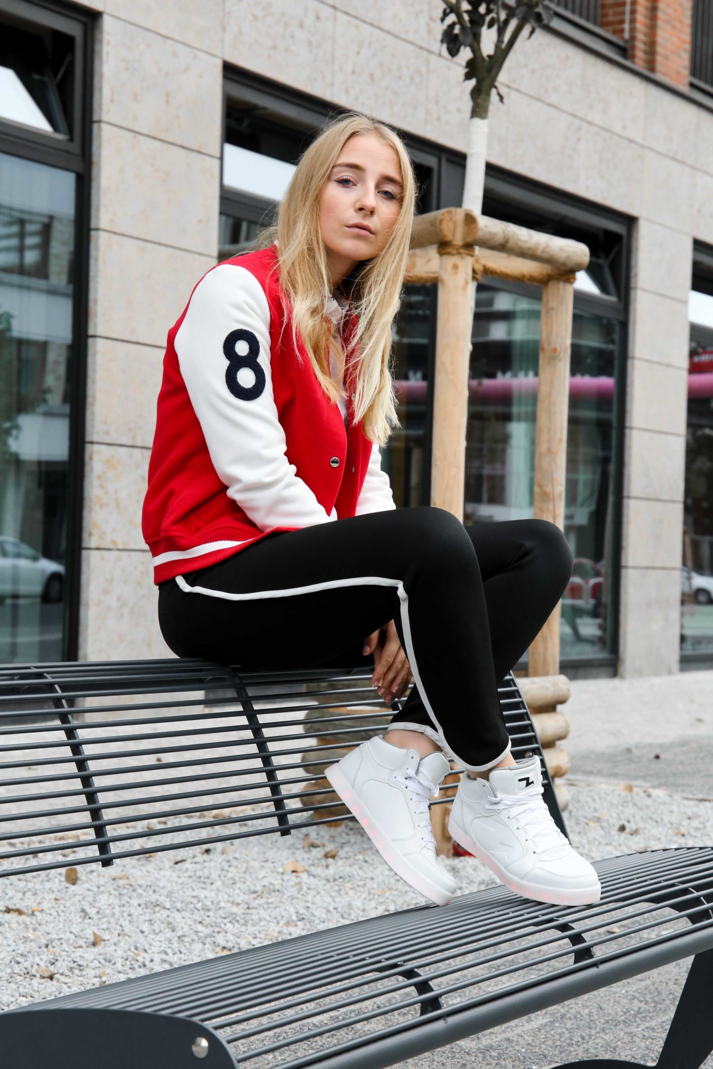 90 Vibes College Jacke Und Led Sneaker Outfit