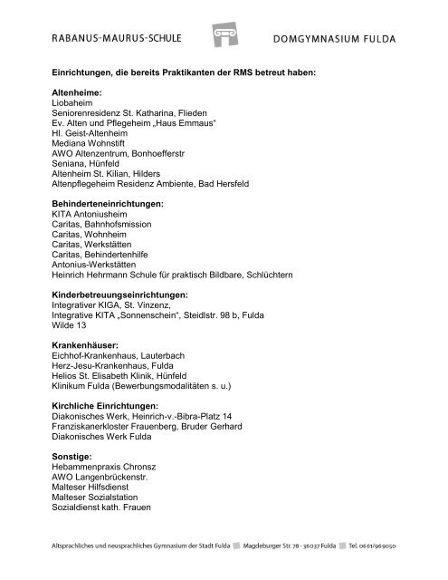 Eine Auswahlliste Von Einrichtungen Fur Das Sozialpraktikum