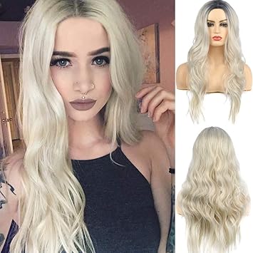 A Monamour Frauen Dunkle Wurzel Lange Blonde Wellige Naturliche Wellen Uberlagerte Haarschnitt Dicke Haare Synthetische Volle Perucke Amazon De Beauty