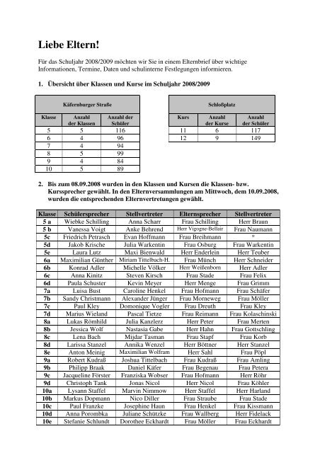 Liebe Eltern, mit diesem Brief möchte sich Ihr, für dieses Schuljahr gewählte, Elternbeirat an Sie wenden Er besteht aus den 14 Klassenelternsprechern, die Sie am ersten Elternabend dieses Schuljahres gewählt haben Die Liste der Elternbeiratsmitglieder hängt im Schaukasten des Elternbeirats im Vorraum des Haupteinganges. Aufgaben und Rechte als Elternsprecher Ihrer Klasse informiert Wir stehen Ihnen aber jederzeit auch für weitere Fragen zur Verfügung Als Elternsprecher sind Sie vor allem für die Informationsweitergabe an die Eltern Ihrer Klasse verantwortlich und den Meinungsaustausch über schulische Angelegenheiten Dies findet vorrangig. Um direkt mit den Eltern in einen guten Kontakt zu kommen, empfehlen wir, dass Sie nach der Wahl einen Brief per EMail an die Klasseneltern schreiben und sich kurz vorstellen Mit dieser Nachricht können Sie auch die Adressliste verschicken Vielleicht möchten Sie etwas über Ihre Ziele und Pläne als.