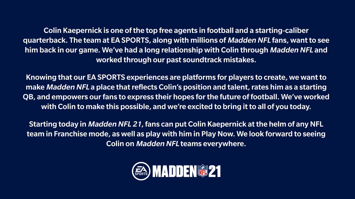 The latest tweets from @EAhelp. Video game publisher EA Sports has seen 13% more players taking the field in Madden NFL 21, released Aug 28—and that's coming off record activity last year, the publisher says Now there's another reason for players to keep playing Madden NFL, which is a perennial topseller They can help fill out the roster for the Virtual Pro Bowl, which will be played Jan 31 using Madden video game. EA community forums for players to get playertoplayer support, ask questions, share their game and troubleshooting experience.