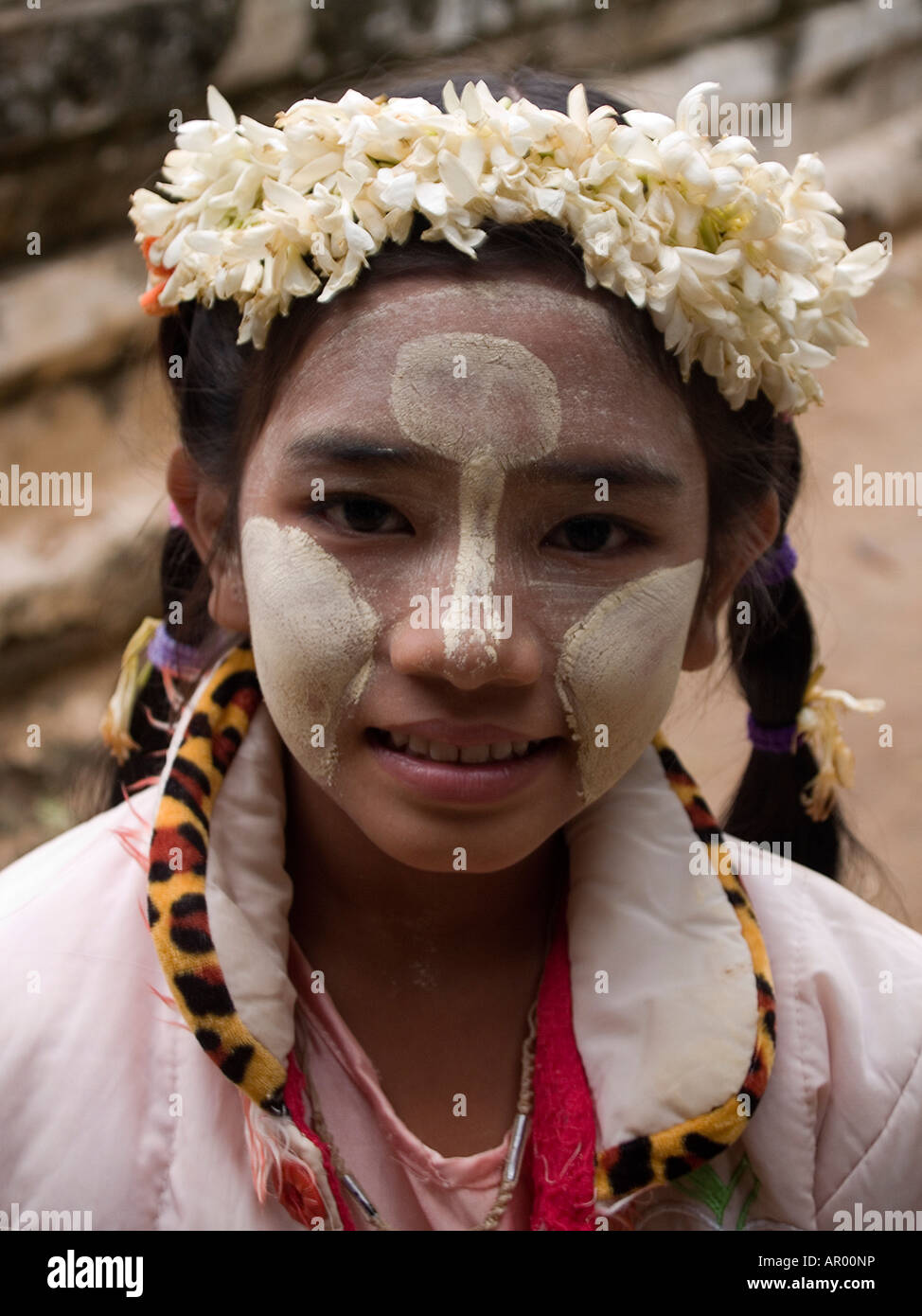 Eine Junge Frau Mit Einem Gesicht Gemalt Mit Thanaka Einem Traditionellen Burmesischen Einfugen Von Baumrinde Hpa An Karen Staat Myanmar Stockfotografie Alamy
