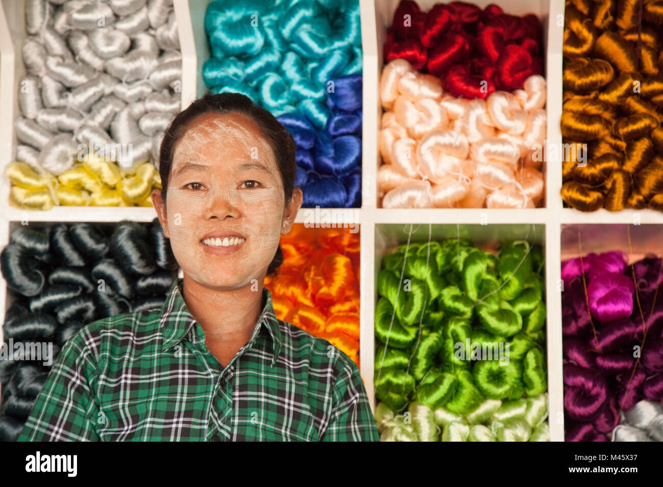 Die Frau Mit Thanaka Einfugen Auf Gesicht Und Gewinde In Fabric Factory Shop In Mandalay Myanmar Stockfotografie Alamy