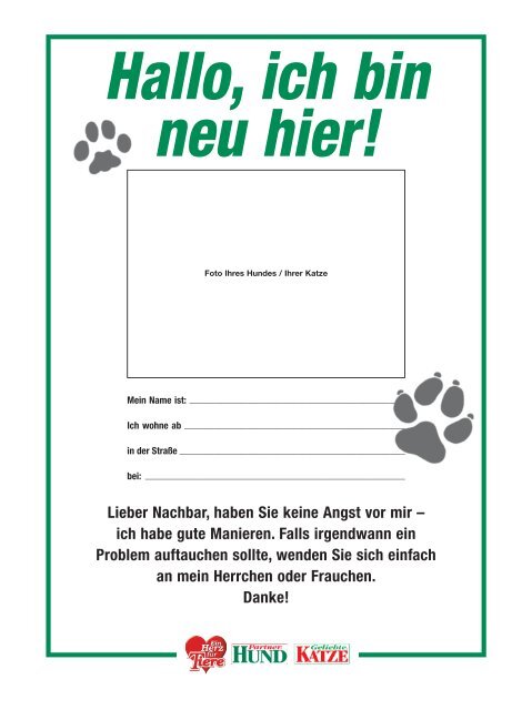 Wenn Sie Ihre Katze oder Ihren Hund bei TASSO vermisst melden, haben Sie die Möglichkeit, eine kostenlose TASSOSuchmeldung mit dem Bild Ihrer vermissten Katze oder Ihres vermissten Hundes auf unserer Homepage und in unserer TASSOApp zu schalten. Werde ein Teil der Community!. Verwenden Sie das Suchplakat des GongVerlags, welches Sie sich von den Seiten wwwgeliebtekatzede herunterladen können (Sie werden ein wenig herunter scrollen müssen Kleiner Tipp Es ist im 4 Absatz!) Sie brauchen nur noch die Daten Ihrer Katze einzutragen bzw nichtzutreffendes streichen.