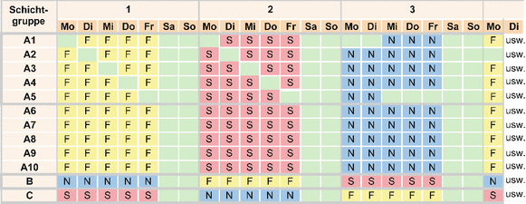 Abb 4 Schichtplanschema für drei Gruppen und eine Betriebszeit von 144 Stunden/Woche Abb 5 Reduzierung der Wochenarbeitszeit durch gleichmäßig verteilte einzelne freie e Bei einer Arbeitszeit von 7,5 Stunden zuzüglich einer unbezahlten Pause von 0,5 Stunden je Schicht ergäbe sich für diesen Plan jedoch eine Wochenarbeitszeit. Ich arbeite jetzt 7 e nacheinander 6 14, 14 22 und 22 6 Uhr Arbeitszeiten, dann habe ich mal einen (1,5 e) oder zwei (2,5 e frei) e frei Das nennt sich 4 Schicht System, da. 4 Schicht VollkontiSchichtmodell für 15Wochen (reduzierter Personalbedarf an Wochenenden) 2 Schicht Modell für 7 eWoche 2 Schicht Modell für 6 eWoche MontagSamstag 3 Schicht Modell für 5 eWoche MoFr vorwärts, 15 Schichtmodell 4 Schicht Vollkontimodell, 21 Schichtmodell.